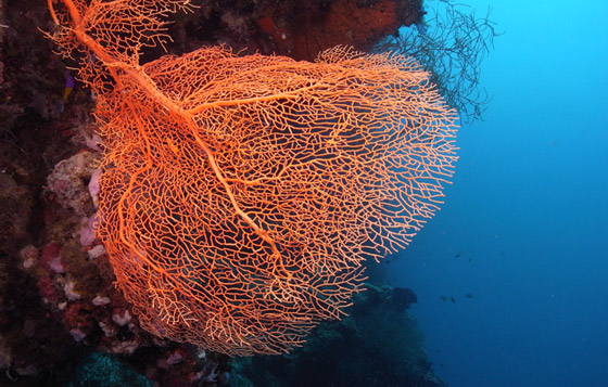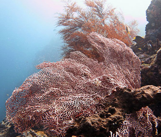 峭壁上长满了海绵和漂亮的柳珊瑚海扇。潜导会帮你找常在这里出没的豆丁海马。在峭壁尽头25米深的地方,有一个巨大的紫色海扇。