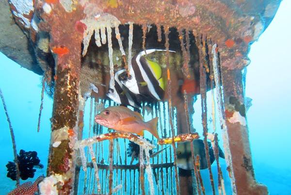 50年以上の時を経て船にはびっしりと珊瑚が付き、魚影も濃くたくさんの生物が住処としてます。