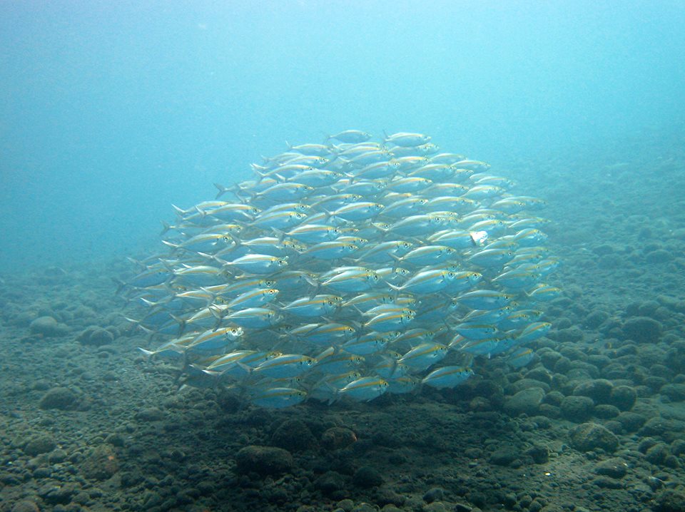 ドロップ・オフではテルメアジの群れが住みついて浅いところにいるので安全停止中に観れます。運がよければロウニンアジなども一緒にいます。